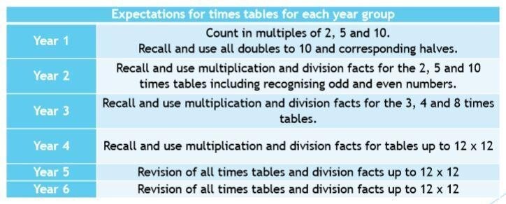 The expectations for learning times tables in each year group are below.