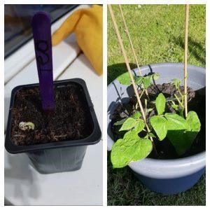 Téo’s bean plant that he brought back on the last day of school VS the plant today. What a transformation!